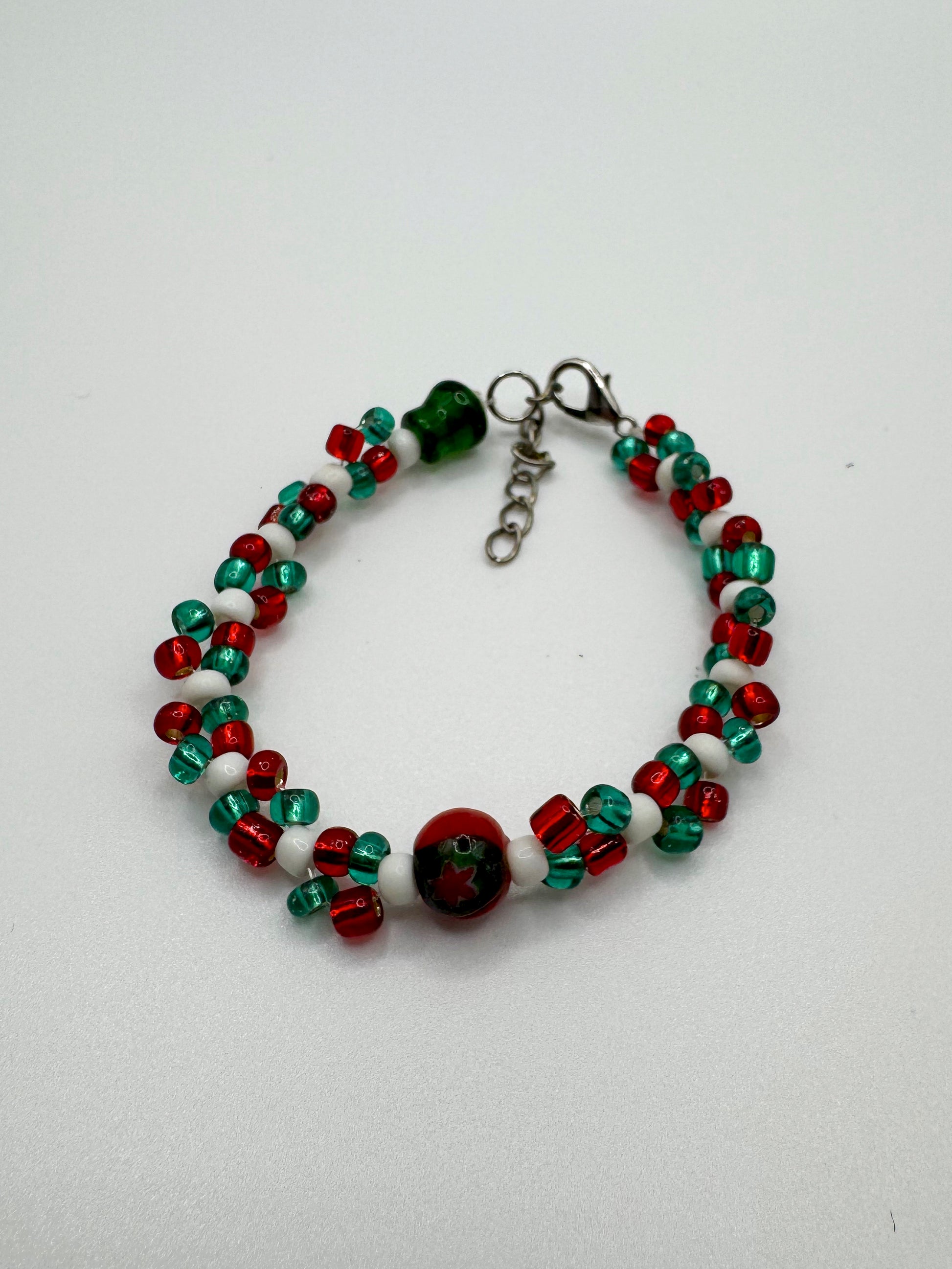 A Christmas colored beaded bracelet with an adjustable silver clasp.