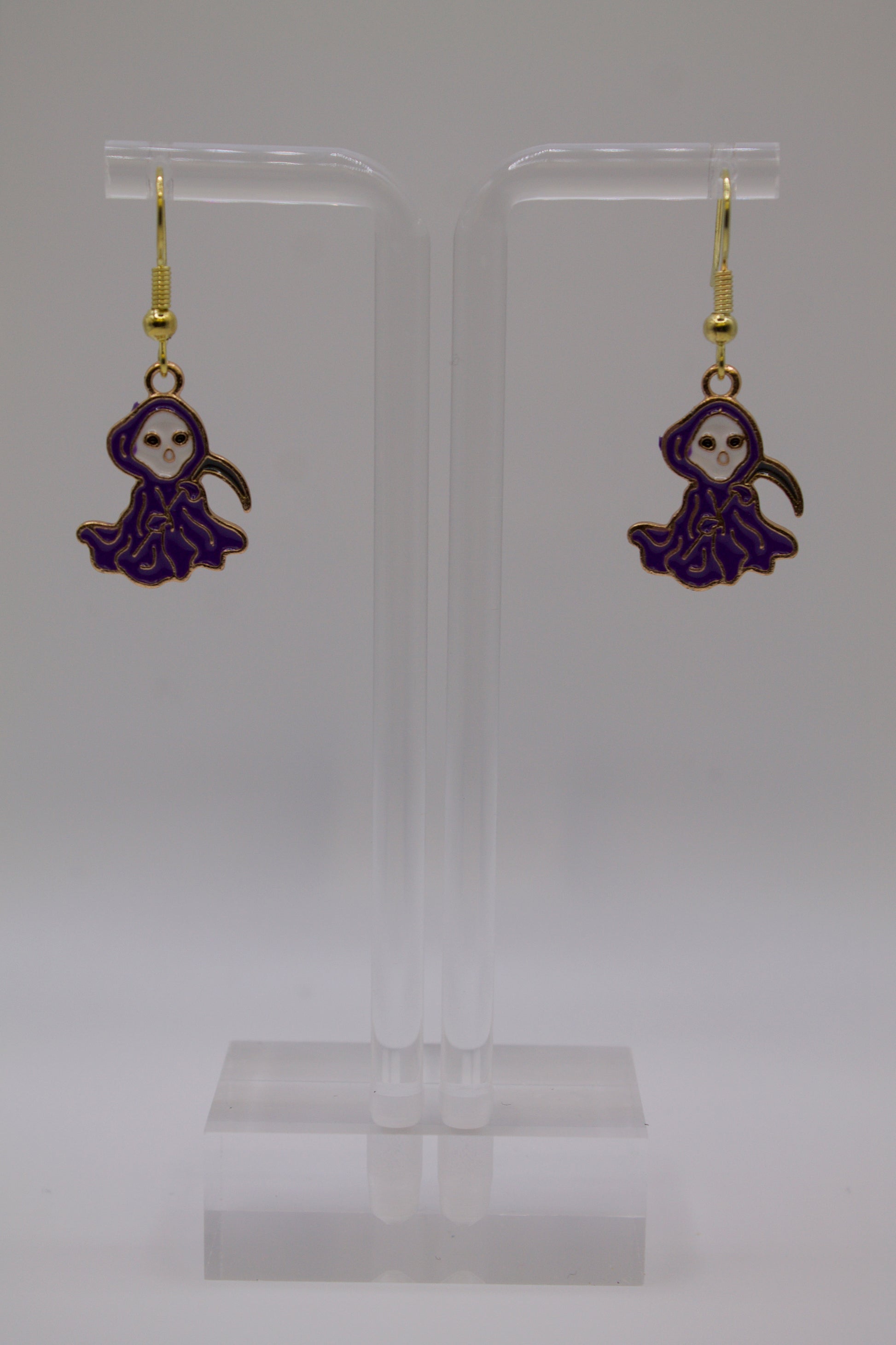 These gold earrings feature a purple grim reaper and are a perfect choice for fans of horror.